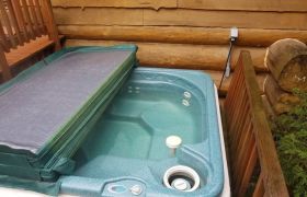 A private, jetted hot tub sits on one side, and on the other a charcoal barbecue and picnic table provide space to enjoy an outdoor meal.